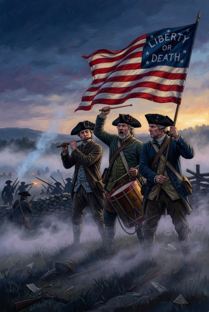 Throughout the early morning of April 19, 1775, a British column marches from the swampy banks of the Charles River, through rain and chill, toward Concord. Their mission is to confiscate arms, munitions, and supplies stored in the town by patriots. After capturing Paul Revere, they realize the mission is no longer covert.